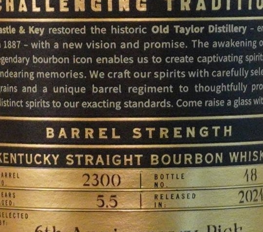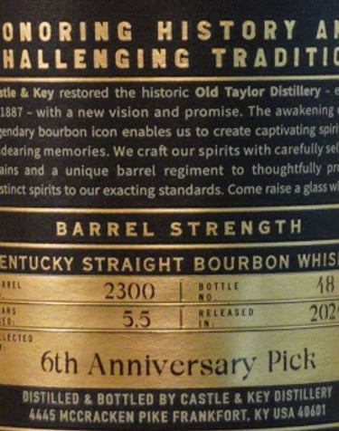 Why I chose it: For the second KY trip in a row we found ourselves at the beautiful site of the old Talyor distillery, now home to Castle & Key. I wasn't planning on picking anything up, however it was the weekend of the Kentucky Bourbon Festival and they just dropped their 6-year anniversary celebration bottle. A single barrel which hopefully represents some of the their best stuff to date. The bottle is beatiful and the experience was nice with the owner of the distillery chatting us up and signing our bottle for the release weekend (signatures below).